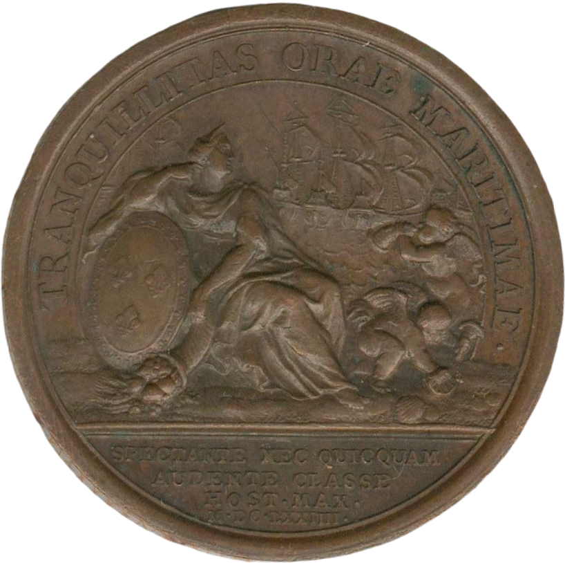 Опис: Жінка, що сидить на березі моря, одягнена в античному стилі та спирається на щит із лілією. Праворуч — двоє маленьких джинів, що граються в піску, а на задньому плані — флот, що виходить у відкрите море.