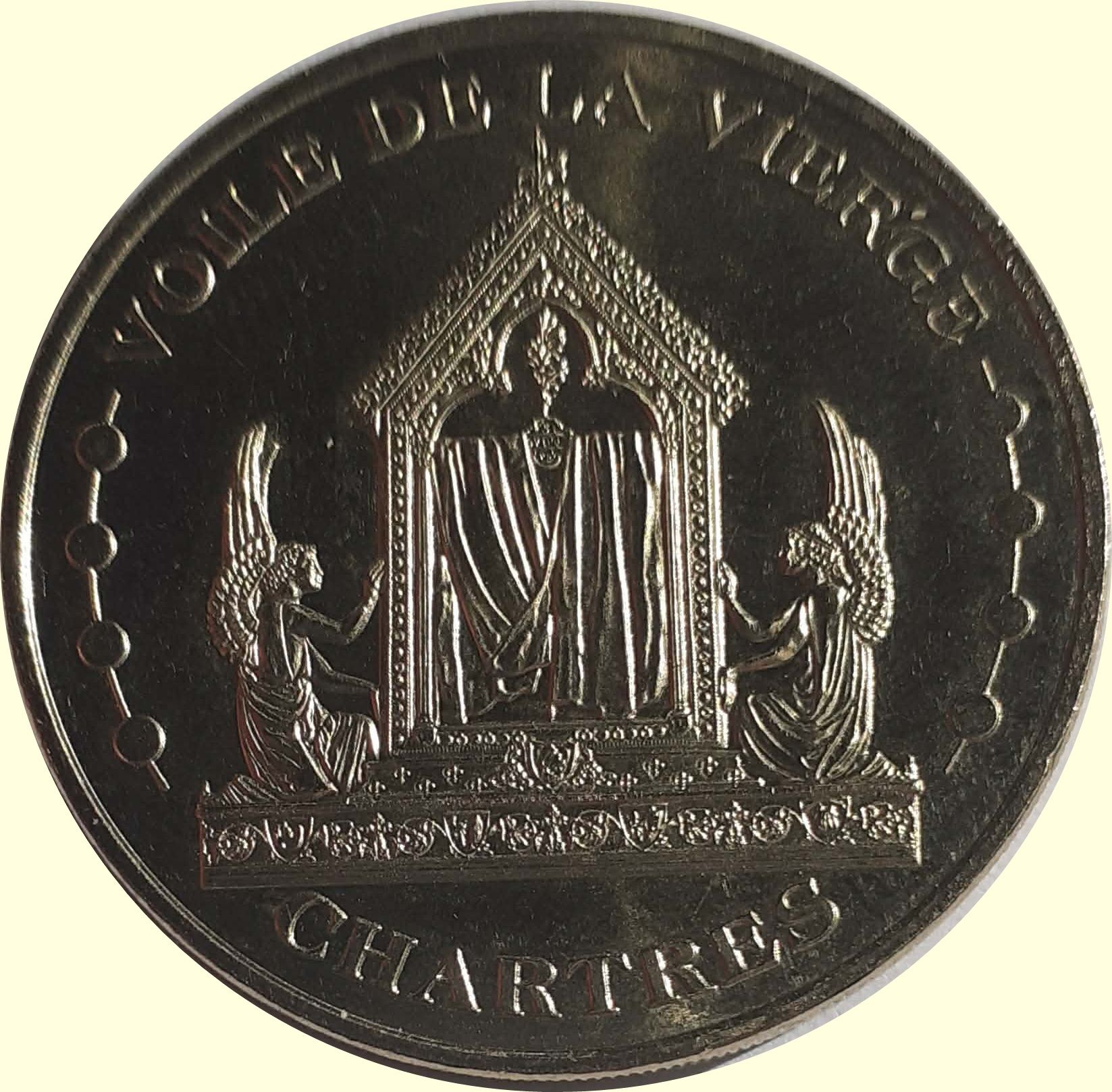Опис: (fr) Voile de la Vierge , Cathédrale de Chartres Le voile de la Vierge de Chartres, connu autrefois sous le nom de « chemise »[1], est une relique qui aurait été envoyée de Byzance par l'empereur d'Orient à Charlemagne.