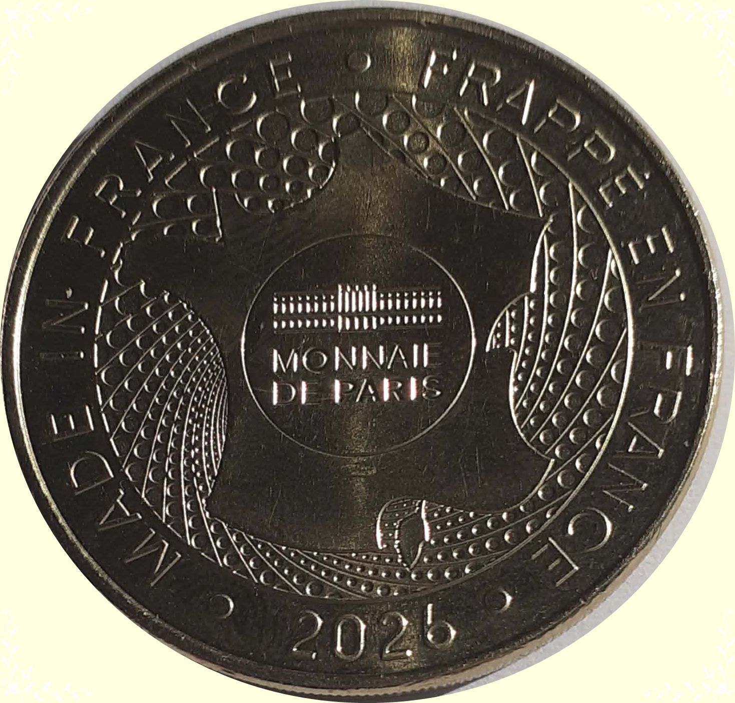 Опис: Стилізована карта Франції з логотипом Monnaie de Paris у колі в центрі.