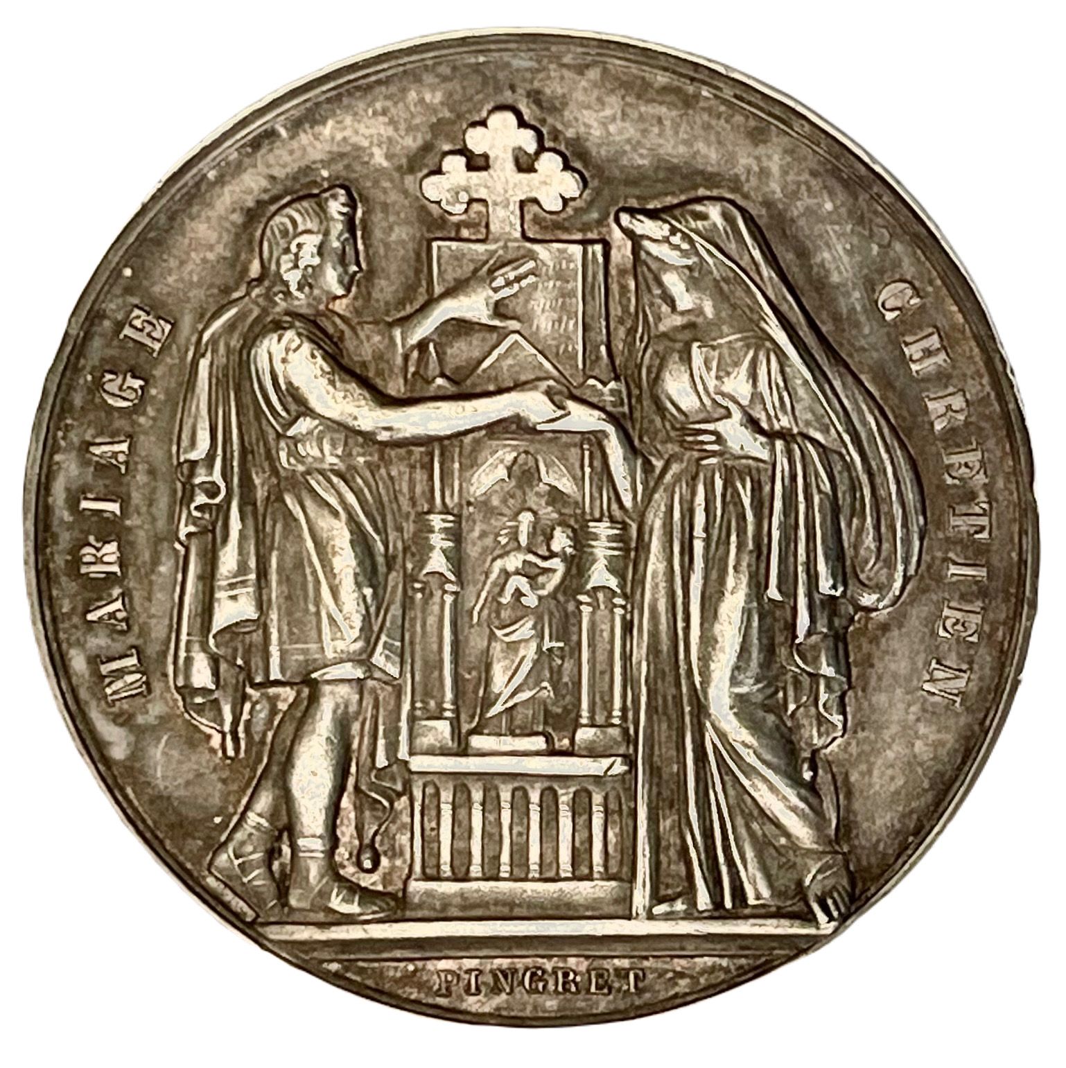 Опис: Двоє наречених, що стоять обличчям до обличчя, одягнені в античні шати, складають присягу перед готичним вівтарем. Праворуч наречений тримає праву руку своєї обраниці та піднімає ліву руку над священною книгою. У центрі вівтаря стоїть сяюча Діва Марія з немовлям. Підпис у нижній частині: PINGRET .