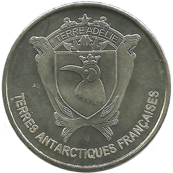 Опис: У центрі — традиційний герб Аделі: два морські слони підтримують щит із зображенням пінгвіна з короною. Над щитом на тлі двох якорів і трьох зірок розміщено напис: TERRE ADÉLIE. Під гербом — TERRES ANTARCTIQUES FRANÇAISES.