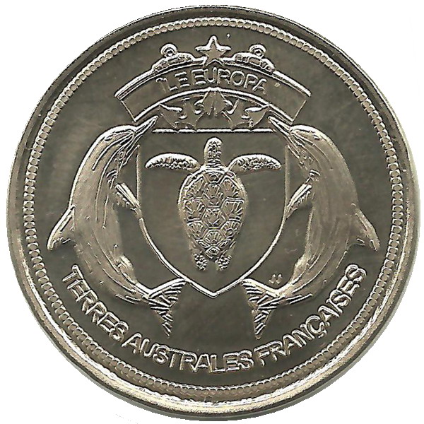 Опис: Емблема Іле-Європа; два дельфіни, що оточують черепаху в щиті, увінчаному прапором з назвою острова та двома якорями. Ініціали пробірника біля хвоста дельфіна праворуч. З написом «Французькі південні території» внизу.
