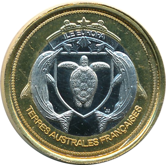 Опис: Емблема Іле-Європа; два дельфіни, що оточують черепаху в щиті, увінчаному прапором з назвою острова та двома якорями. Ініціали пробірника біля хвоста дельфіна праворуч. З написом «Французькі південні території» внизу.