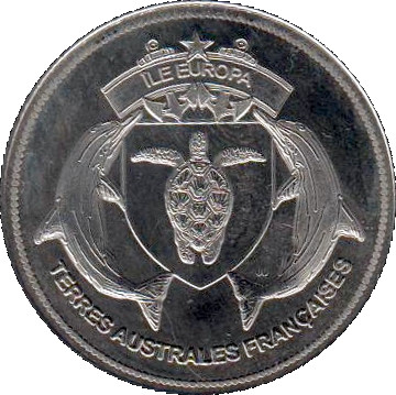 Опис: Емблема Іле-Європа; два дельфіни, що оточують черепаху в щиті, увінчаному прапором з назвою острова та двома якорями. Ініціали пробірника біля хвоста дельфіна праворуч. З написом «Французькі південні території» внизу.