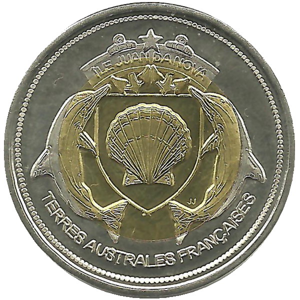 Опис: Острів Жуан-да-Нова — емблема; два дельфіни, що оточують мушлю в щиті, увінчаному прапором з назвою острова та двома якорями. Ініціали пробірника біля хвоста дельфіна праворуч. З написом «Французькі південні території» внизу.