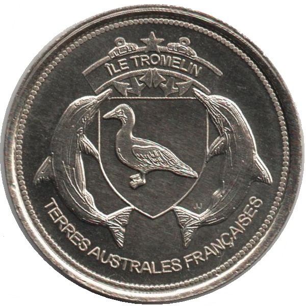 Опис: Острів Тромелін: емблема; два дельфіни, що оточують качку в щиті, увінчаному прапором з назвою острова та двома якорями. Ініціали пробірника біля хвоста дельфіна праворуч. З написом TERRES AUSTRALES FRANÇAISES внизу.