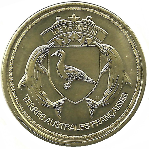Опис: Емблема острова Тромелін (два дельфіни, що оточують качку в щиті, увінчана прапором з назвою острова та двома якорями) та ініціали пробірника біля хвоста дельфіна праворуч з написом TERRES AUSTRALES FRANÇAISES внизу.