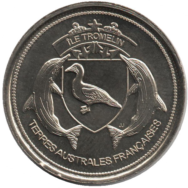 Опис: Острів Тромелін: емблема; два дельфіни, що оточують качку в щиті, увінчаному прапором з назвою острова та двома якорями. Ініціали пробірника біля хвоста дельфіна праворуч. З написом TERRES AUSTRALES FRANÇAISES внизу.