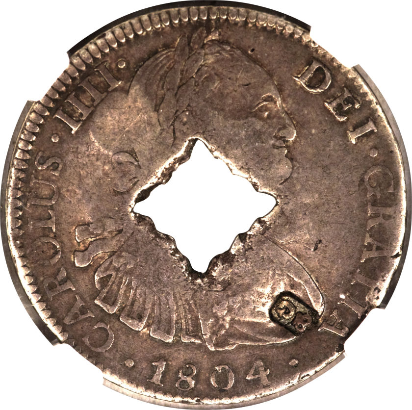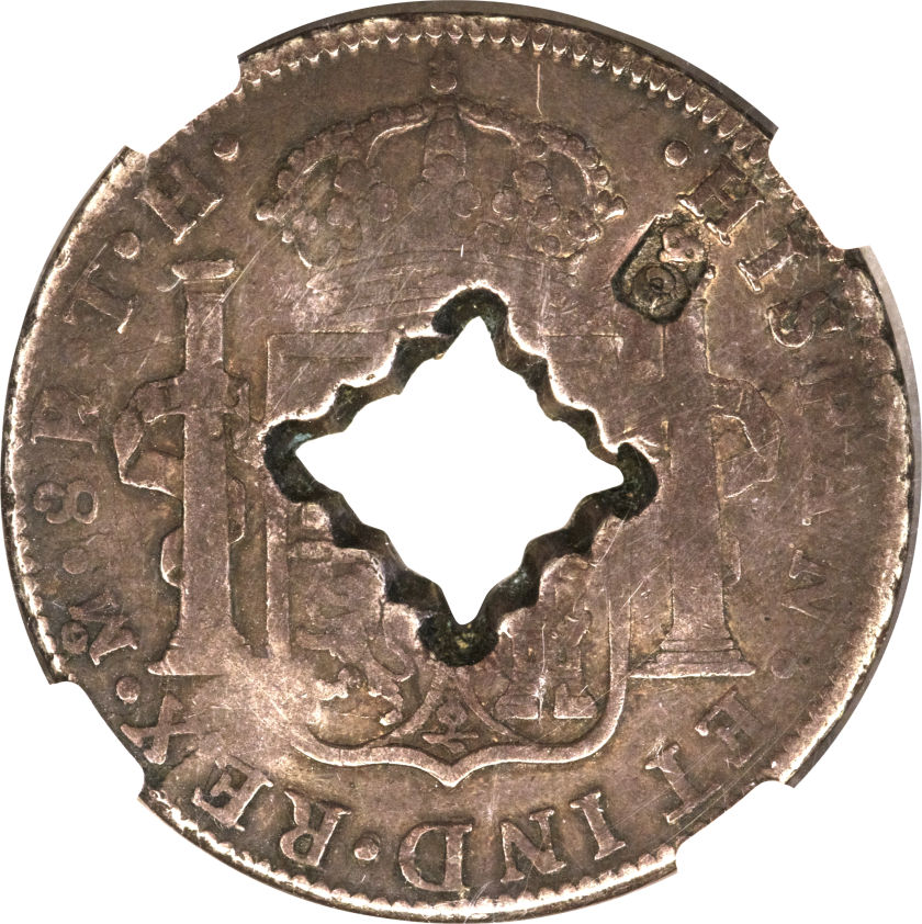 Опис: Контрмарка «Коронована G» на аверсі та реверсі мексиканської монети 8 реалес, KM#109, з зубчастим квадратним отвором. Оригінальний аверс: бюст, звернений праворуч.