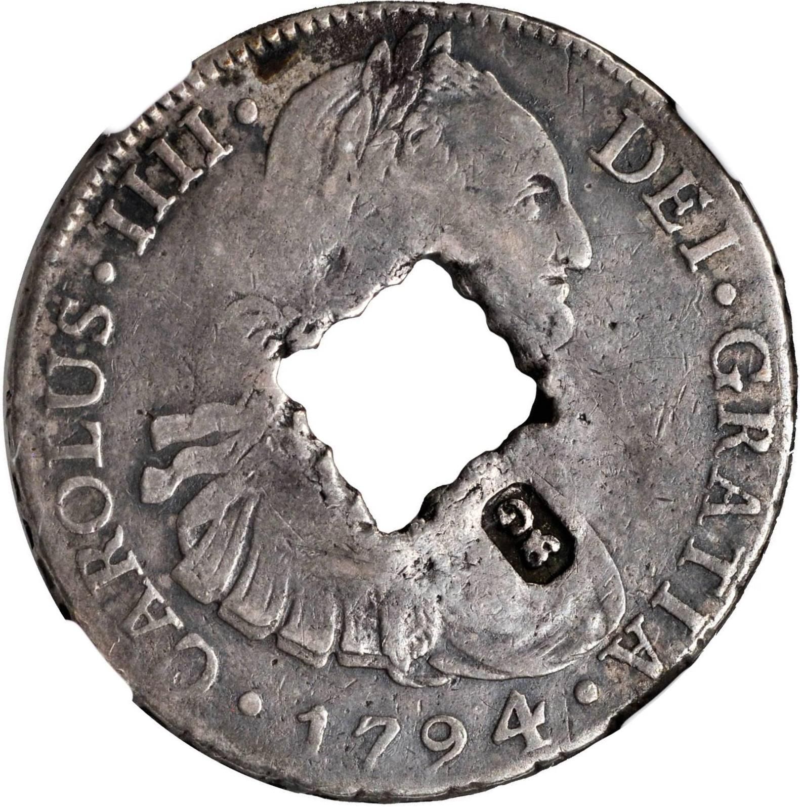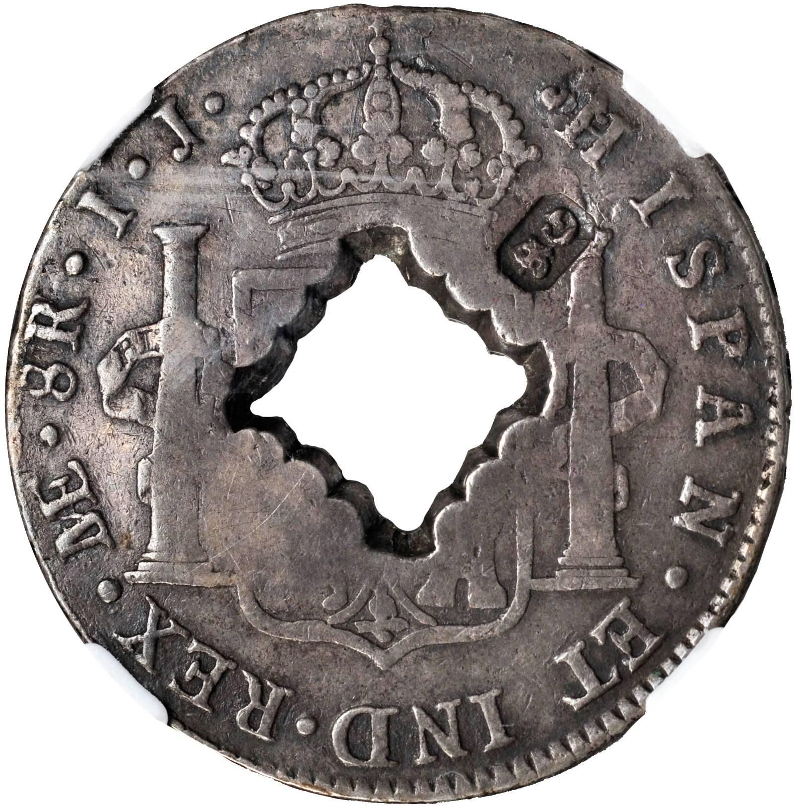 Опис: Контрмарка «Коронована G» на аверсі та реверсі монети Перу (Ліма) 8 реалів, KM#97 з зубчастим квадратним отвором. Оригінальний аверс: бюст Карла IV, праворуч.