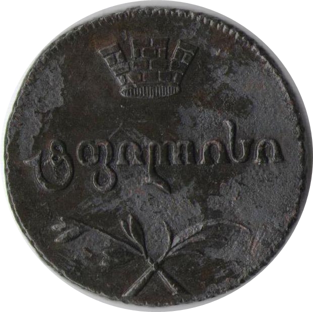 Опис: Номінал у перських динарах, але грузинськими літерами. «ი» = 10 (динарів) 2-рядковий грузинський напис у центрі Рік випуску грузинськими літерами