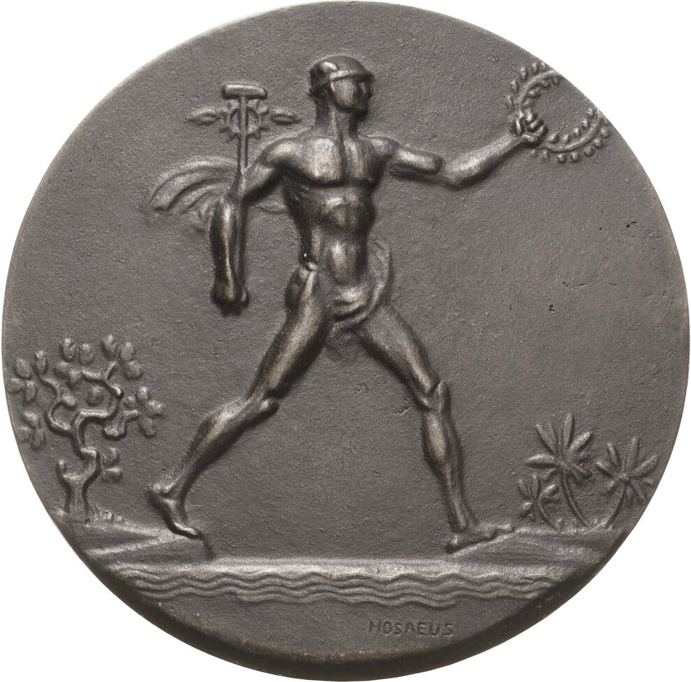 Опис: Меркурій з крилатим молотом і лавровим вінком, що крокує і дивиться вправо, дерево ліворуч і пальми праворуч.