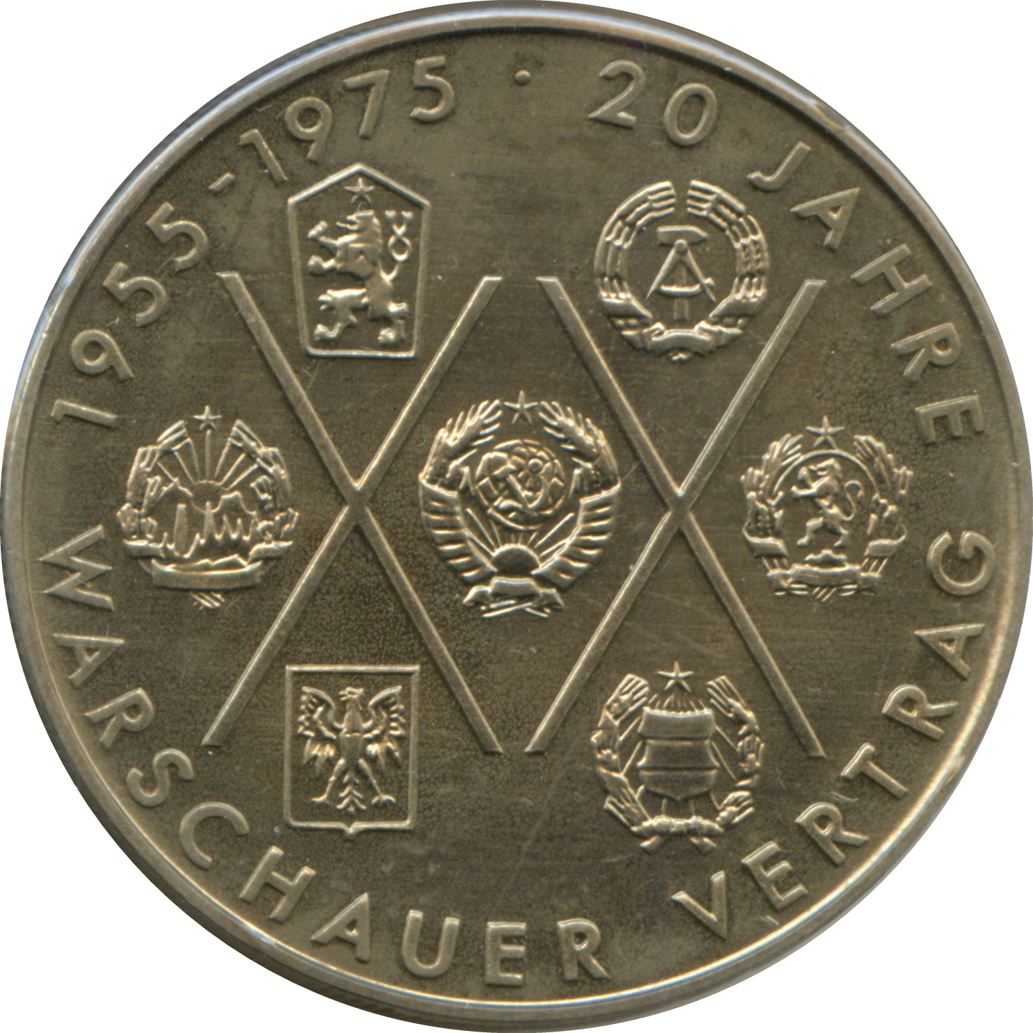 Опис: Цифра XX, що позначає 20-ту річницю укладення пакту, оточена 7 гербами держав-членів (перший ряд: Чехословаччина, НДР; другий ряд: Румунія, СРСР, Болгарія; третій ряд: Польща, Угорщина). Слід зазначити, що Албанія спочатку була членом пакту, але вийшла з нього в 1968 році.