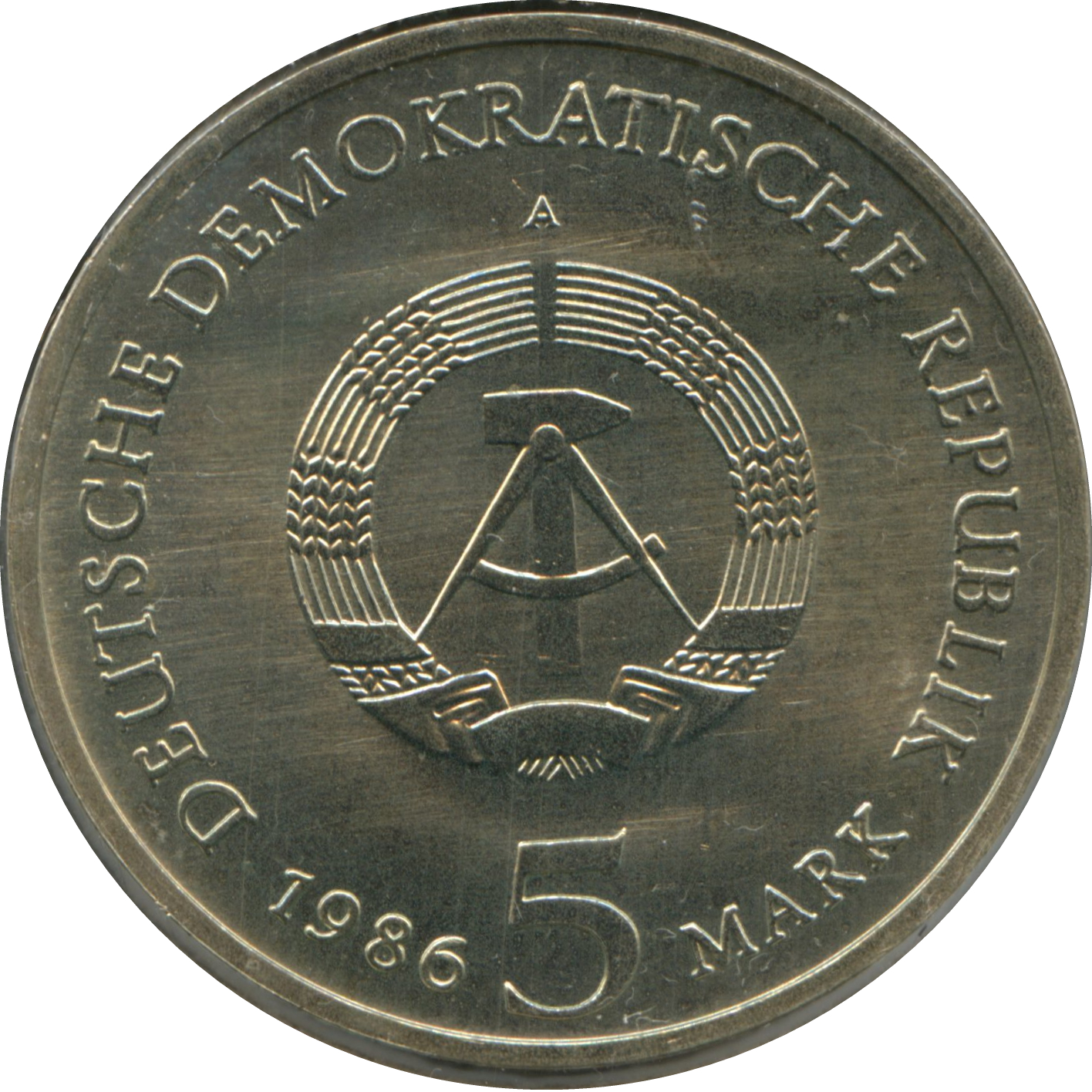 Опис: Емблема Німецької Демократичної Республіки Берлінський монетний знак (A) Дата випуску та номінал