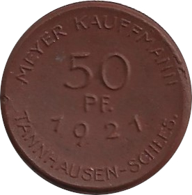 50 пфеннігів — Таннгаузен (Meyer Kauffmann) 1921 – 1921 Таннгаузен, Вюстегірсдорф, Обер-Вюстегірсдорф і Блюменау, міста
