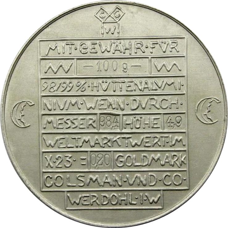 Mit Gewähr für - 100 g - 98/99% Hüttenaluminium wenn Durchmesser 98,4 Höhe 4,9 Weltmarktwert im X 23 = 0,20 Goldmark Colsmann und Co Werdohl I W