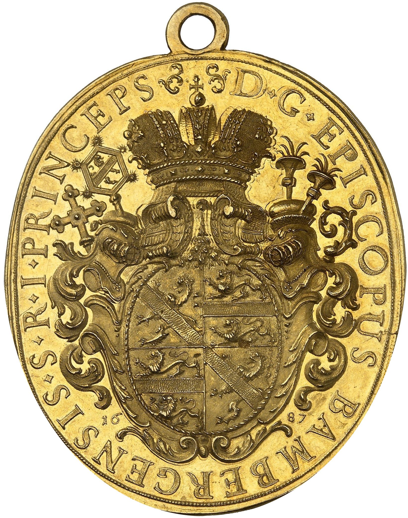 Опис: Чотирипольовий герб (герб роду Бамберг/Штауффенберг) у картуші, прикрашеному двома шоломами, за ним — перехрещений хрест і пастирський посох, над ними — корона.