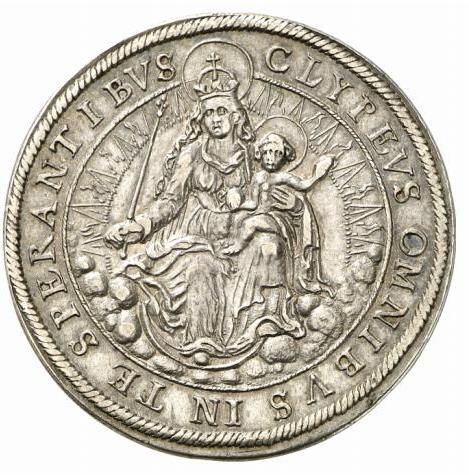 Опис: Овальний щит з чотирикратним гербом Баварії та Пфальца, підтриманий двома левами, герцогська шапка зверху, Орден Золотого Руна підвішений знизу. Напис за годинниковою стрілкою, починаючи з верхнього правого кута, з датою римськими цифрами в кінці.