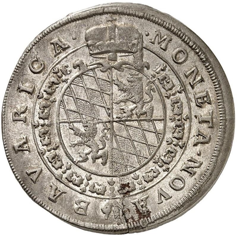 Опис: Овальний щит з чотирикратним гербом Баварії та Пфальца, герцогська шапка зверху, Орден Золотого Руна навколо, все в одному лінійному колі.