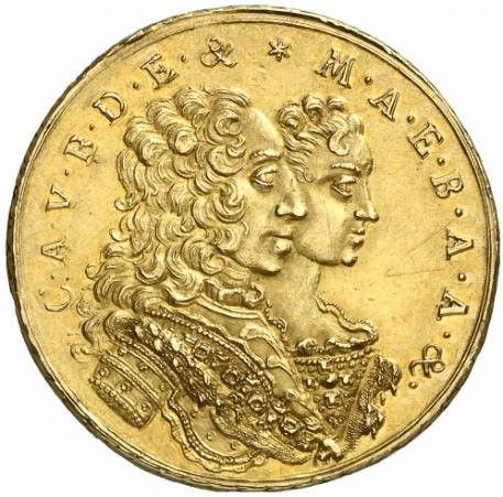 Опис: Праворуч — зображення Карла Альбрехта та Марії Амалії. Надпис зверху.
