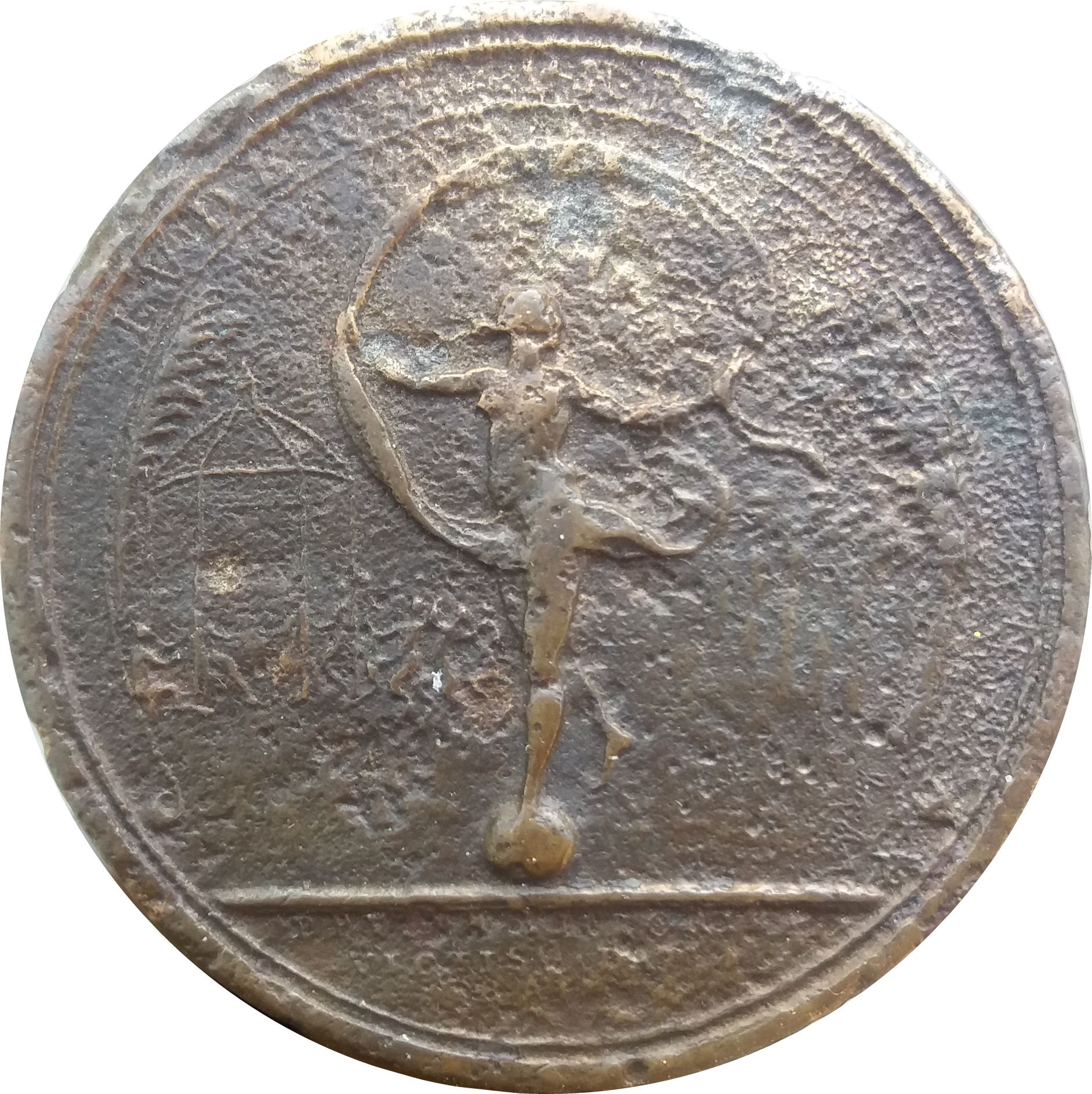 Опис: Банкет у Реймсі. Оголена жінка стоїть ліворуч на глобусі, дивлячись праворуч, тримаючи довгу драперію над головою; позаду — сцена банкету в садах (джерело Numisbids).