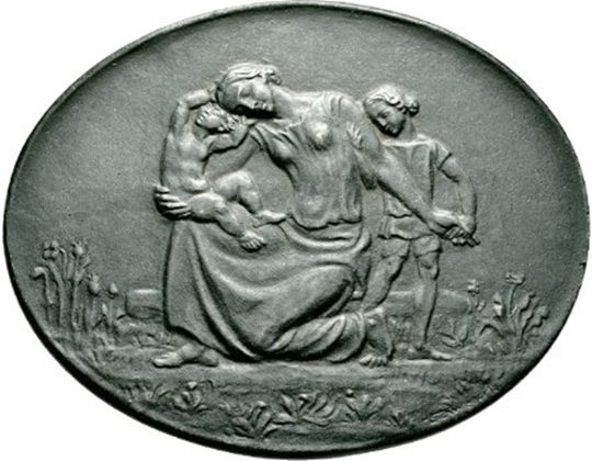 Опис: Вдова, що стоїть на колінах з двома дітьми.