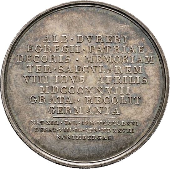 ALB . DVRERI // EGREGII . PATRIAE // DECORIS . MEMORIAM // TER . SAECVLAREM // VIII IDVS APRILIS // MDCCCXXVIII // GRATA . RECOLIT // GERMANIA
