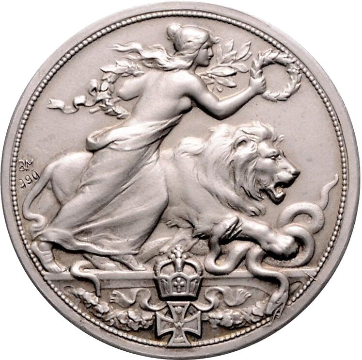 Опис: Перемога, що тримає лаврові вінки та лаврову гілку, на тлі лева праворуч з передньою лапою над двома зміями, під короною над залізним хрестом і гірляндою.