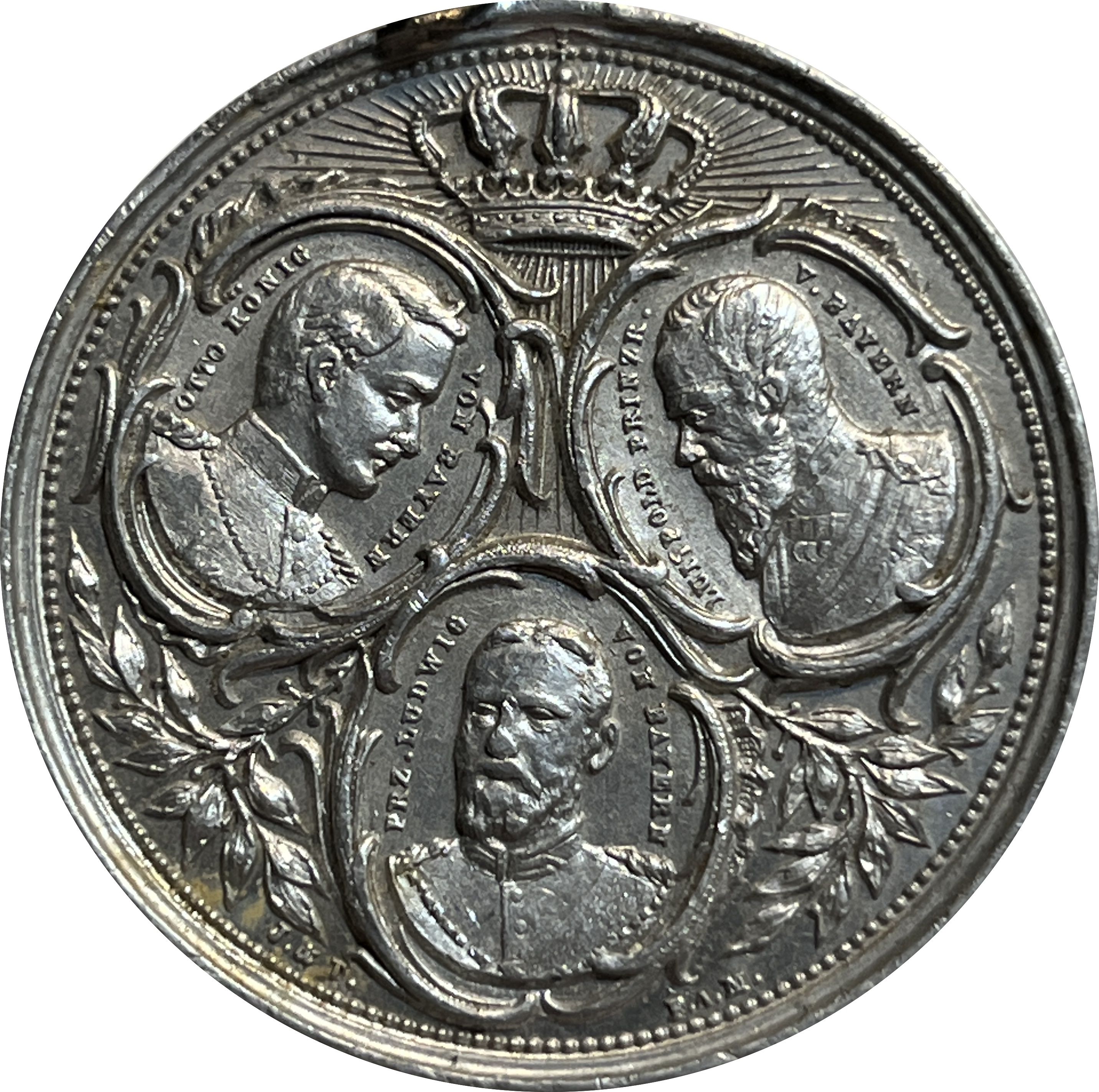 Опис: Зображення Отто Вільгельма Луїтпольда Адальберта Вальдемара фон Віттельсбаха, короля Баварії (1886-1913) у верхньому лівому куті, Луїтпольда Карла Йозефа Вільгельма Людвіга, принца-регента Баварії (1886-1912) у верхньому правому куті та Франца, принца Баварії та командира 2-го піхотного полку «Кеніг» у нижньому куті.