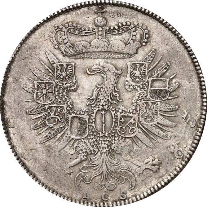 Опис: Орел з дев'ятьма руками на грудях і крилах, корона зверху, дата знизу, розділена ініціалами офіційного представника монетного двору.