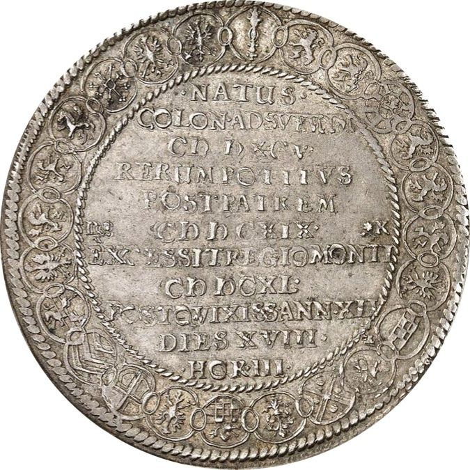 Опис: 11 рядків напису, де 6-й рядок розділяє ініціали офіційного представника монетного двору, а 8-й — дату римськими/грецькими цифрами, все оточене 24 ручками.