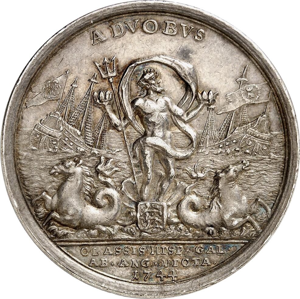 Опис: Нептун стоїть у мушлі, яку тягнуть два морські коники, у кожній руці він тримає корону, біля його ніг лежить англійський леопардовий щит, а на задньому плані у відкритому морі тонуть галеони.