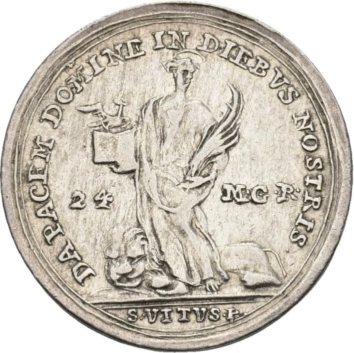 Опис: Повна фігура святого Віта з пальмовою гілкою, книгою та птахом, розділяє 24 - M.G.R., S. VITVS. P. в екзергу.