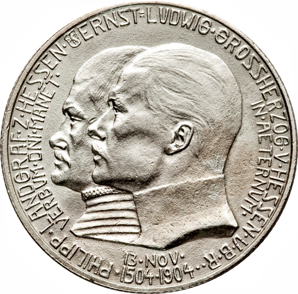 Опис: Бюст Філіпа Великодушного та Ернста Людвіга ліворуч, навколо — напис.