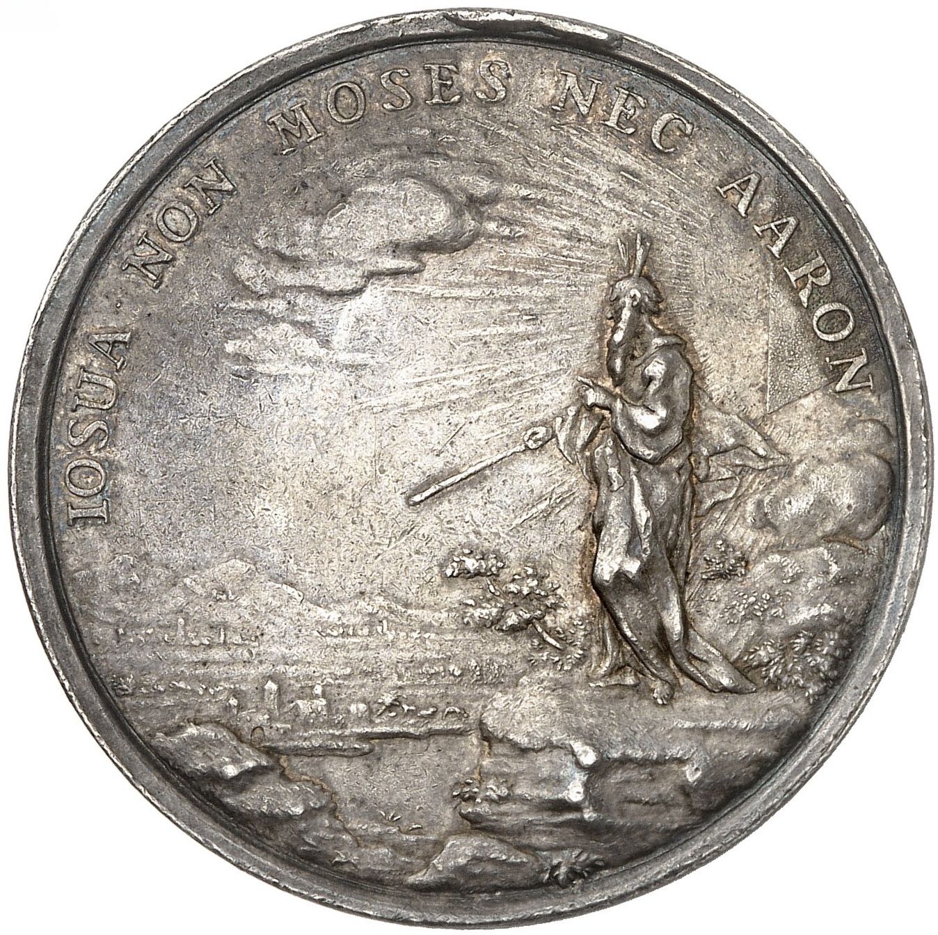 Опис: Фігура священика, що стоїть на скелі серед пейзажу, дивиться вліво, з його голови виходять промені, схожі на роги, ліва рука піднята, у правій руці він тримає посох, за ним промені.