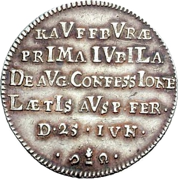 KAVFFBVRÆ / PRIMA IVBILA / DE AVG. CONFESSIONE / LÆTIS AVSP. FER. / D. 25 . IVN.