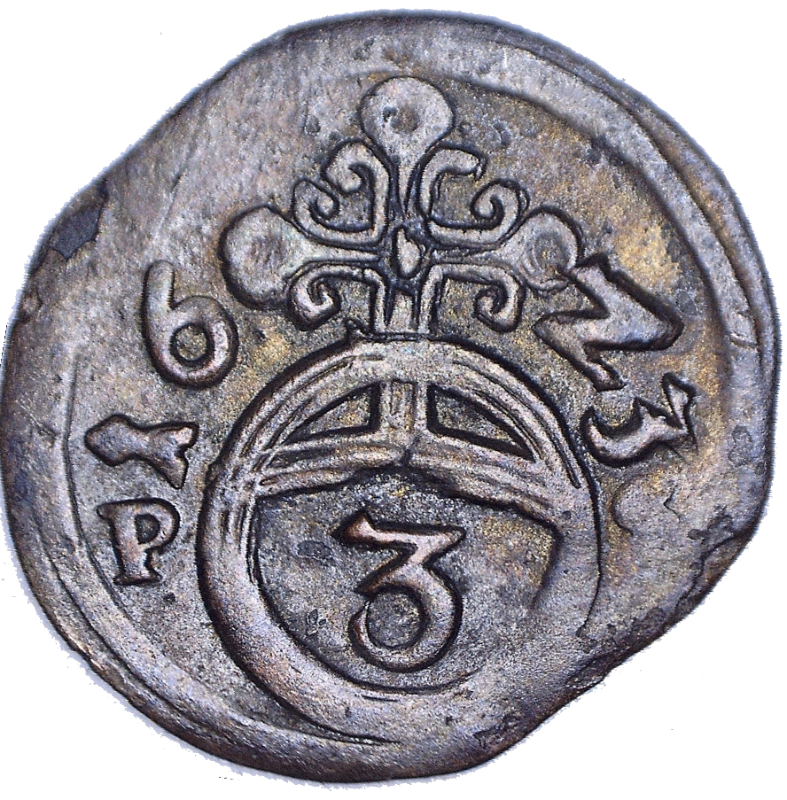 Опис: Імперський шар з цифрою 3 всередині, що розділяє дату та ініціали представників монетного двору.