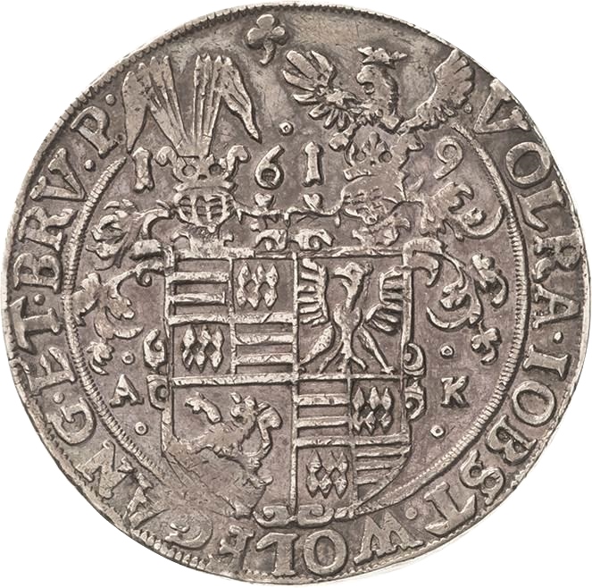 1 талер — Вольрат VI, Йобст II, Вольфганг III та Бруно III 1616 – 1619 Мансфельд-Артерн, графство