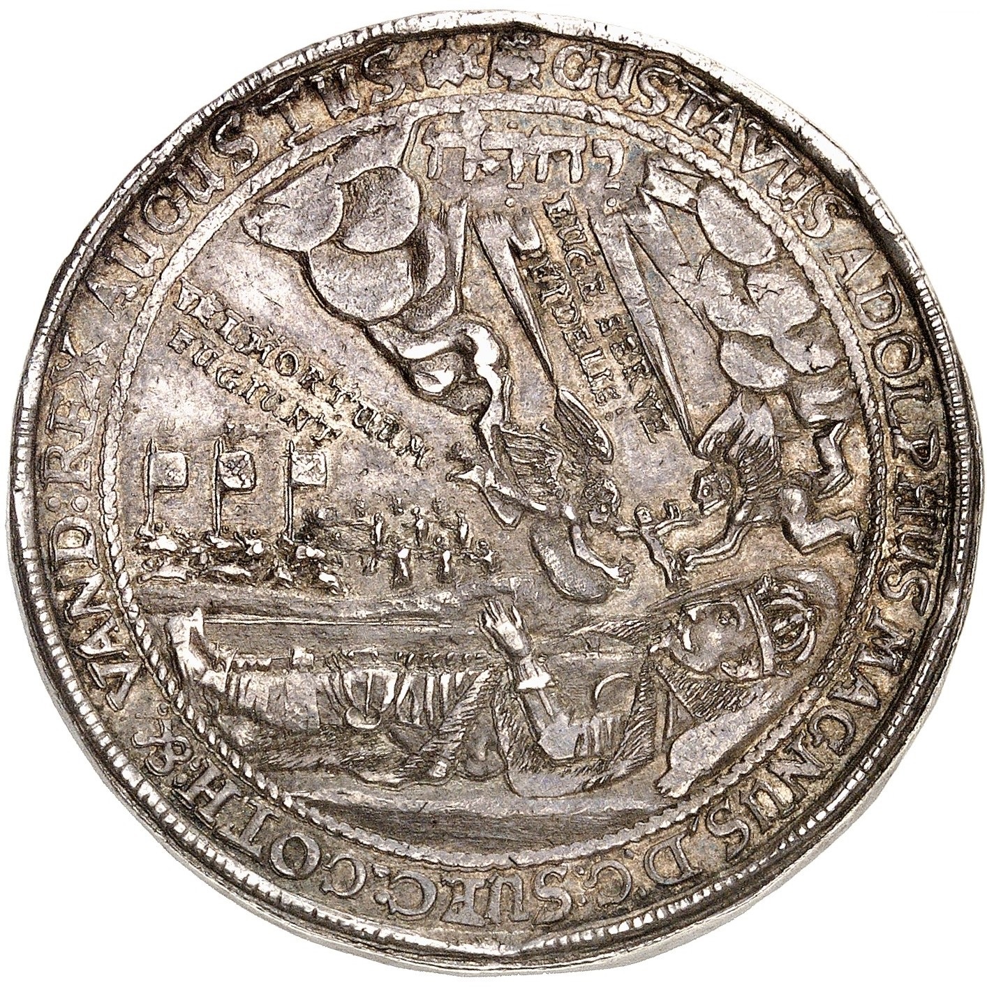 Опис: Густав, одягнений у обладунки, тримає Біблію та меч, їде на колісниці, запряженій трьома крилатими кіньми, над Гідрою Розбрату; ліворуч — Віра, яка тримає Біблію, увінчану палаючим серцем, а праворуч — Мужність, яка тримає колону, обидві увінчують короля лавровим вінком; на колесі колісниці.