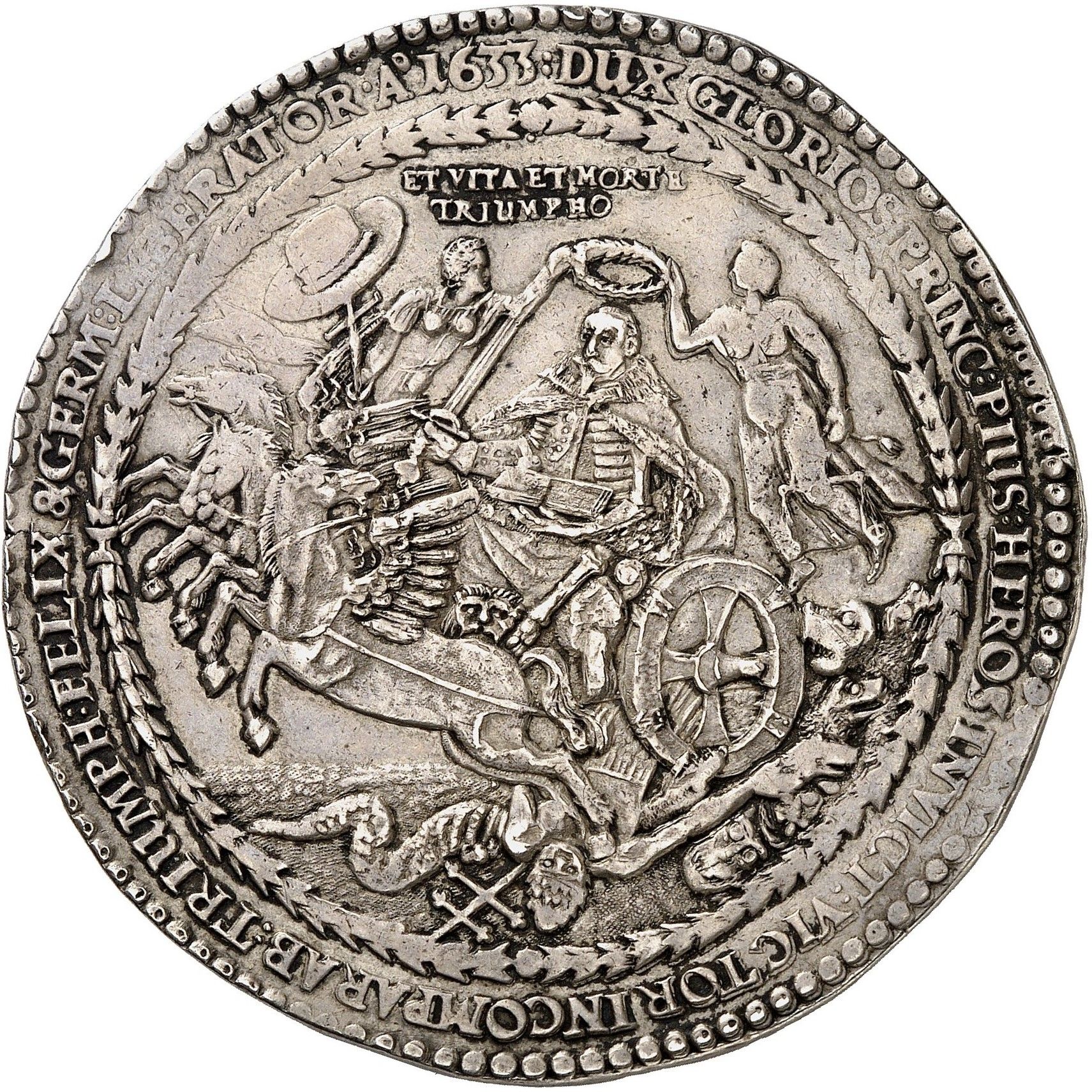 Опис: Густав, одягнений у обладунки, тримає Біблію та меч, їде на колісниці, запряженій трьома крилатими кіньми, над Гідрою Розбрату; ліворуч — Віра, яка тримає Біблію, увінчану палаючим серцем, а праворуч — Мужність, яка тримає колону; обидві увінчують короля лавровим вінком; на колесі колісниці.