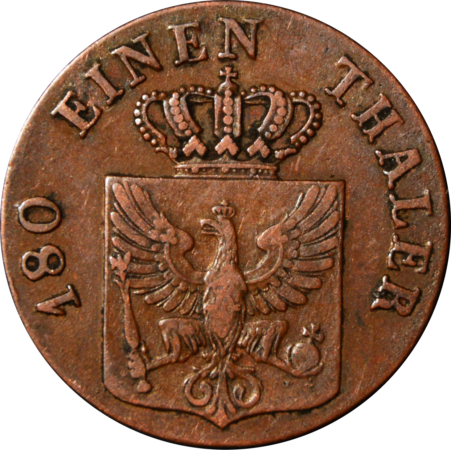 Опис: Коронований герб Пруссії з коронованим і розгорнутим орлом, у лівій лапі якого земна куля, а в правій — скіпетр, оточений легендою та гренетисом.