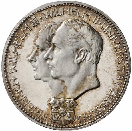 Опис: Зліва зображені голови короля Фрідріха Вільгельма III та імператора Вільгельма II. Внизу — герб міста Бреслау. Навколо — легенда.