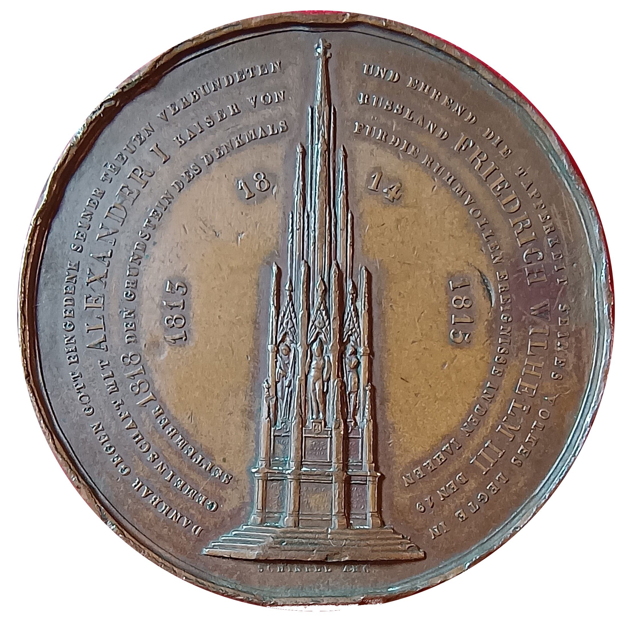 DANKBAR GEGEN GOTT EINGEDENK SEINER TREUEN VERBUNDETEN UND EHREND DIE TAPFERKEIT SEINES VOLKES LEGTE IN GEMEINSCHAFT MIT ALEXANDER I KAISER VON RUSSLAND FRIEDRICH WILHELM III DEN 19 SEPTEMBER 1818 DEN GRUNDSTEIN DES DENKMALS FÜR DIE RUHMVOLLEN EREIGNISSE IN DEN JAHREN 1813 - 1814 -1815