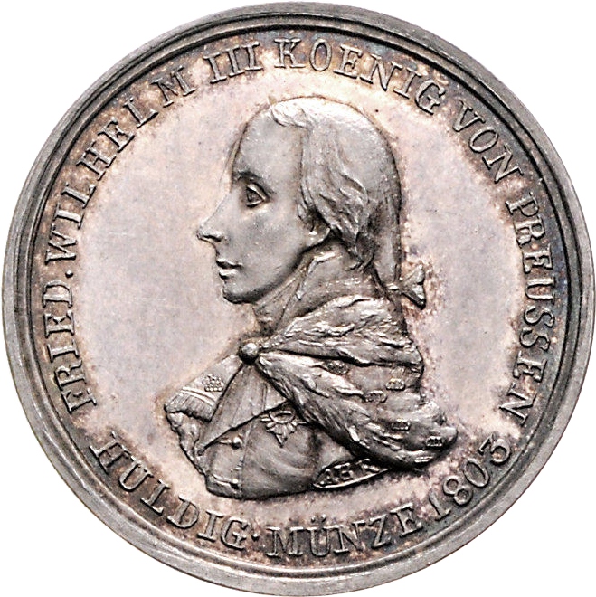 Опис: Бюст Фрідріха Вільгельма III ліворуч, вигнутий нижче напису HULDIG. MÜNZE (дата).