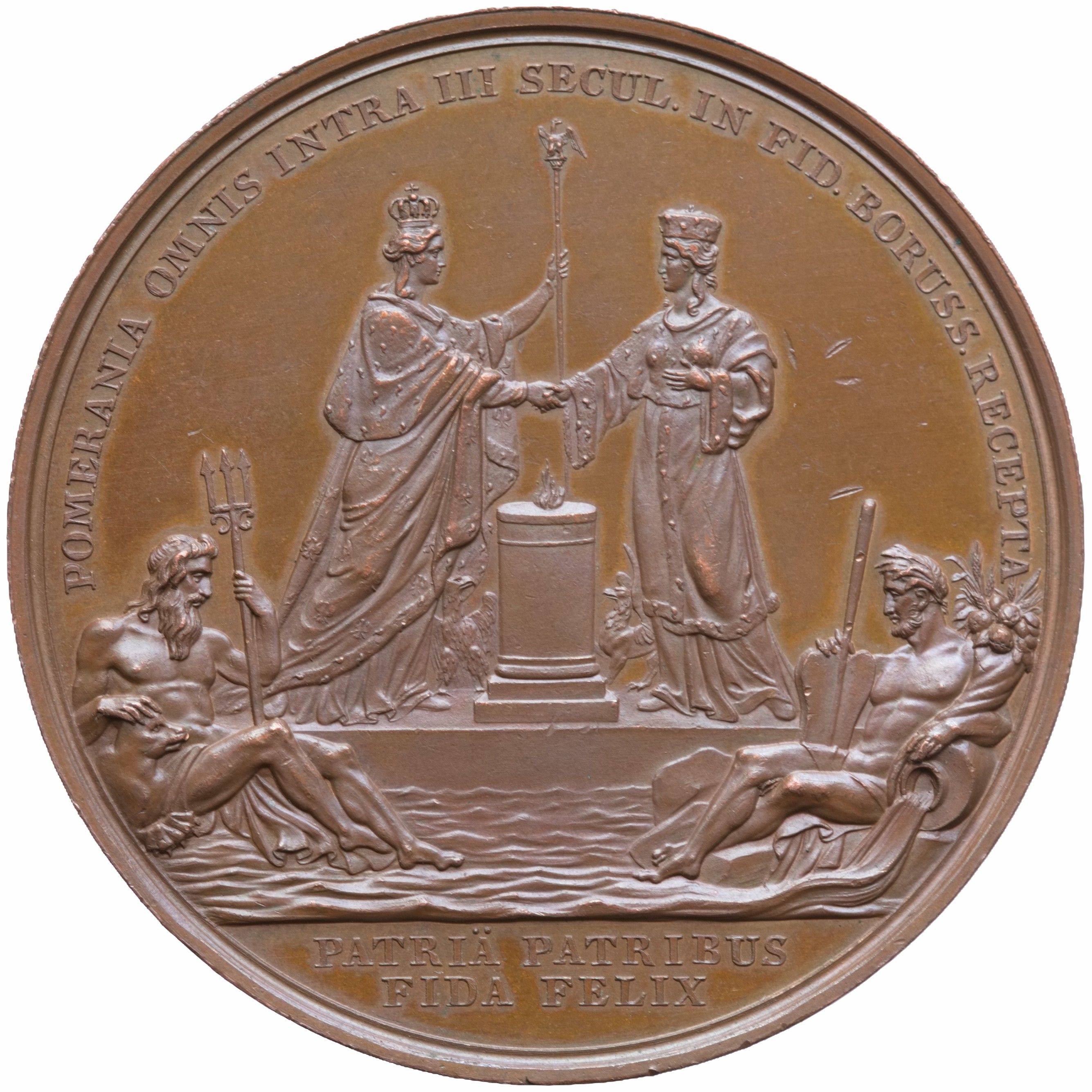 Опис: Бюсти Великого курфюрста Фрідріха Вільгельма I та Фрідріха Вільгельма III, звернені ліворуч / Борусія приймає присягу на вірність від Померанії, на передньому плані — Нептун і Віадрус.