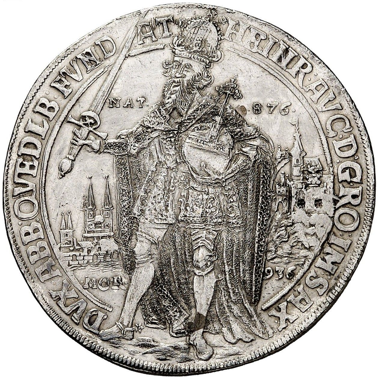 Опис: Повна фігура імператора Генріха I (918-36), що стоїть, тримаючи меч і державу, на тлі міста.
