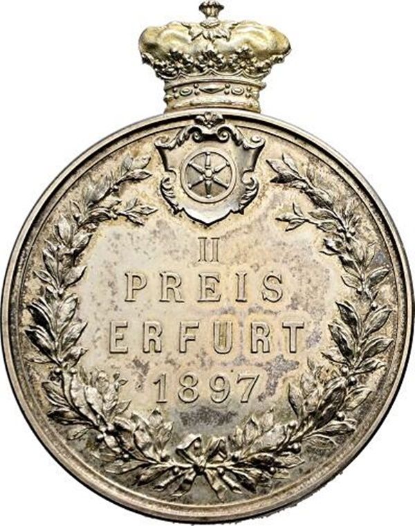 Медаль за 2-е місце — виставка в Ерфурті «Про чистокровне розведення сріблясто-сірих вівчарок веймаранерів» 1897 – 1897 Саксен-Кобург-Гота, герцогство