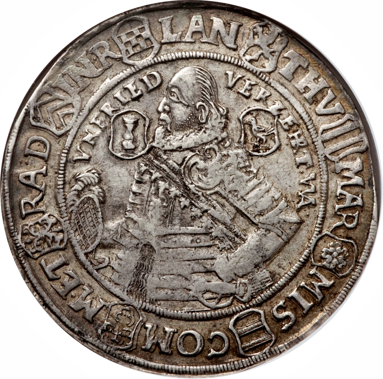Опис: Великий гербовий бюст Жана Ернеста ліворуч, який тримає шолом у правій руці, в облямованому крузі. Напис переривається 8 щитами.