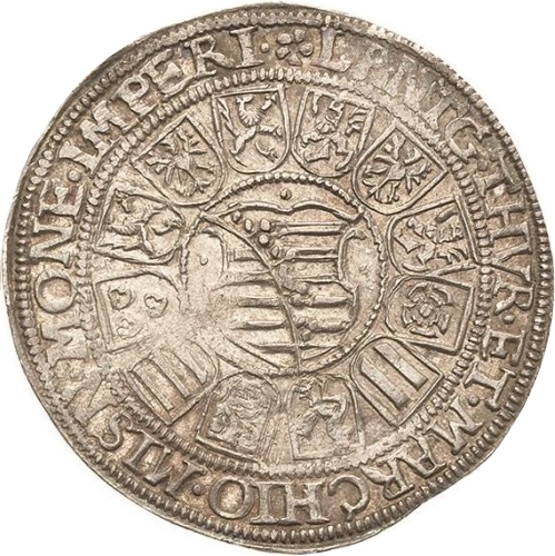 Опис: Герб Саксонії в колі, навколо 12 маленьких гербових щитів.