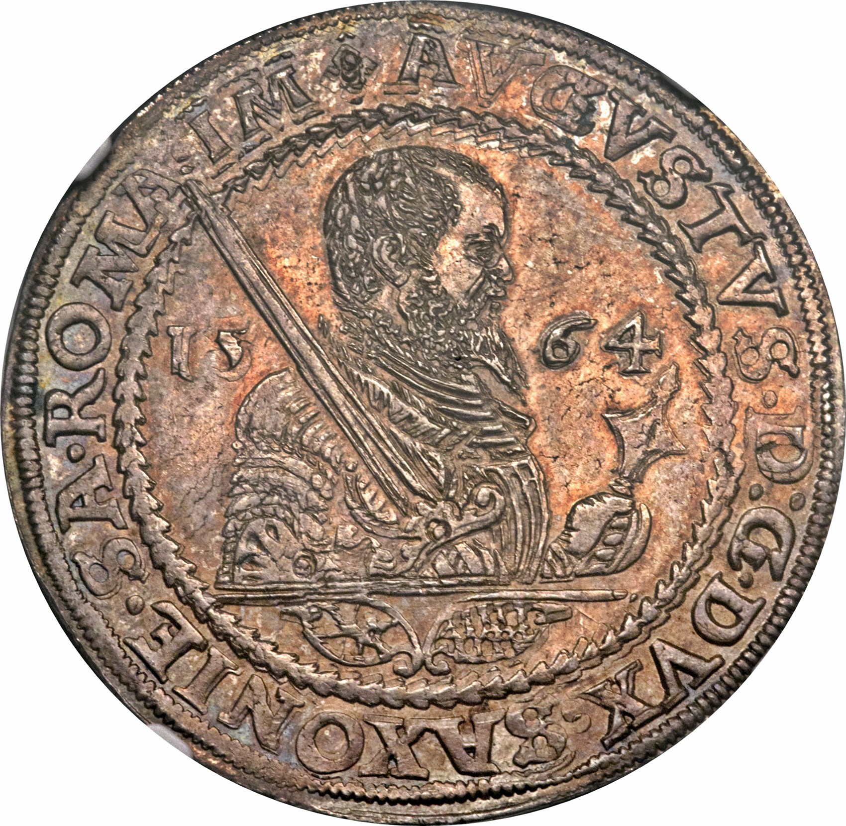 Опис: Правий бюст з мечем над правим плечем розділяє дату, 2 маленькі щити курфюрста і герцога Саксонії внизу, титули Августа I.